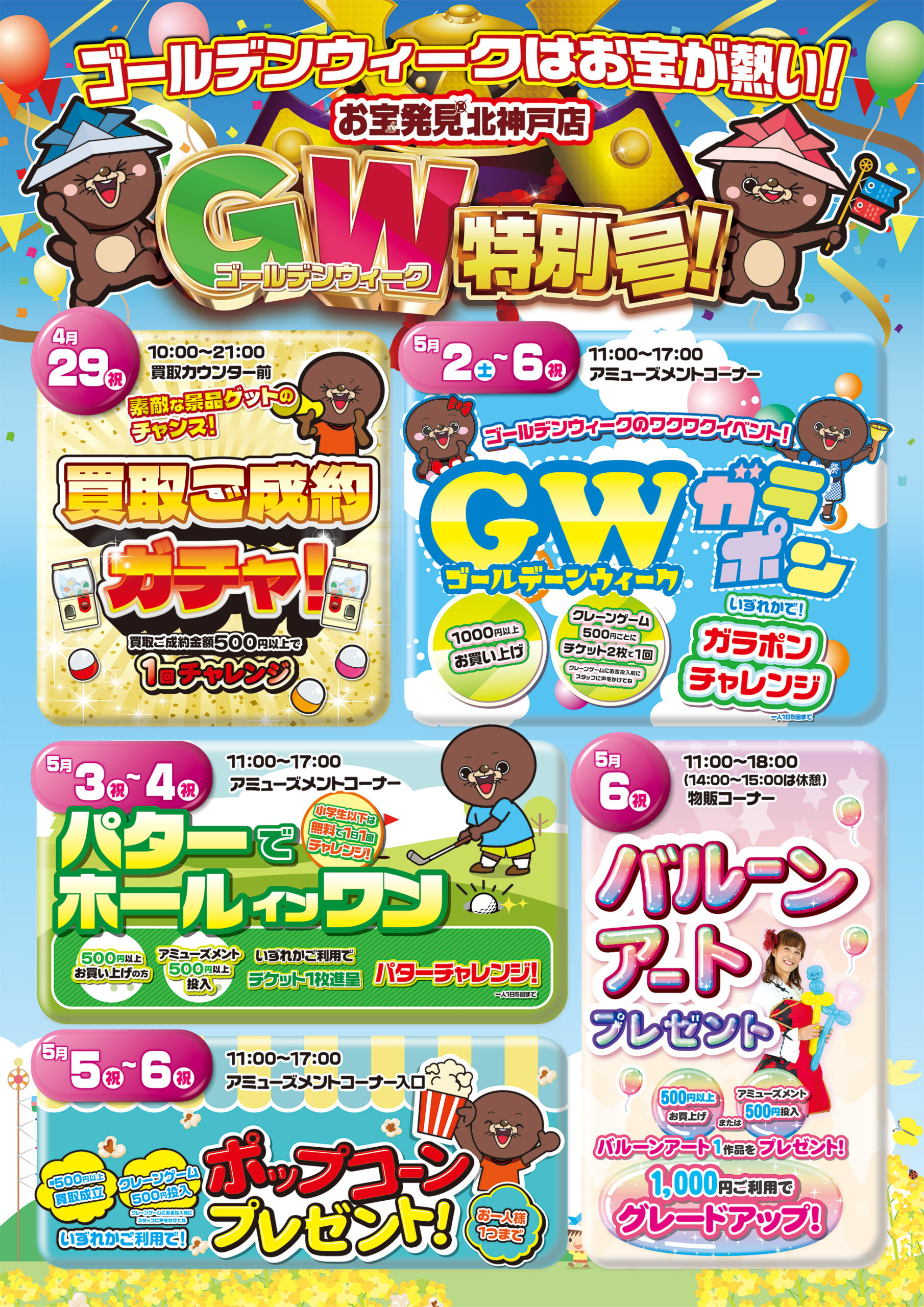 お宝発見北神戸店 2026年GWのイベントカレンダー♡ イベント 2026年4月24日 お宝発見北神戸店 2026年GW特別号! GWはお宝が熱い🔥 4月29日 素敵な景品ゲットのチャンス! 買取ご成約ガチャ🎯 5月2日~6日 GWのワクワクイベント♬ GWガラポン🎯 5月3日~4日 小学生以下は無料で1日1回チャレンジ! パターでホールインワン⛳ 5月5日~6日 いずれかのご利用で☆ ポップコーンプレゼント🎁 5月6日 いずれかのご利用で♫ バルーンアートプレゼント🎈 2026年のGWもイベントがいっぱいの お宝発見北神戸店に是非お越しください♪